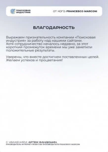От лица всего коллектива благодарю членов команды «Поисковой индустрии» за безупречную работу с нашим проектом. Мы довольны результатом и рассчитываем на продолжение взаимовыгодного сотрудничества.